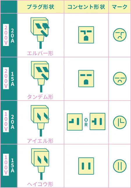 - コンセント:2種類あり。左側は逆L字か回転させた凸の字で右側が縦線
