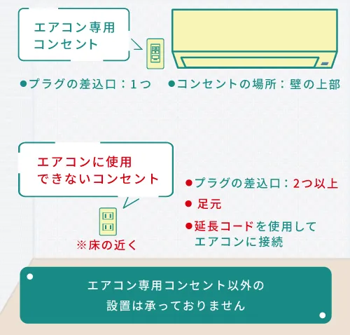エアコンの設置には、専用コンセントが必要です。なお、メーカーの設置基準により、専用回路以外のコンセントや延長コードは、発熱や発火の恐れがあるため、使用できません。