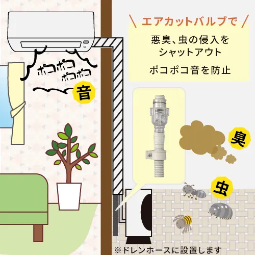 ドレンホースからの虫の侵入を防ぎ、空気の逆流による「ポコポコ音」を抑える部品です。